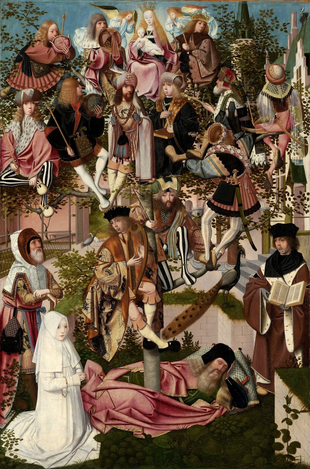 Jesse, King David’s father, is usually shown in this motif sleeping on the ground, with a tree coming out of his side, populated with Christ’s ancestors; the Virgin and Child may be at the top, as here, or in the middle. Since the inclusion of all 27 ancestors given in St Matthew’s Gospel between Jesse and Christ would make the composition far too crowded, a selection of them is given, twelve kings of Judah, from David to Manasseh. King David, the author of the Psalter, is depicted with a harp on the lowest branch; Solomon is shown half kneeling to the right. Further up, Abia lifts his father Roboam onto the next branch, next to whom are shown Abia’s son Asa, Ozias with a book, Josaphat with a hawk, a large necklace and a purse, Joram with a fur hat in his hands, and Joatham. Around the Virgin at the top are Achaz, a wicked and idolatrous kings, Ezechias, one of the holy kings, and Manasses (to the right of the Virgin, with the crown and scepter), an idolatrous king who repented. (It is Achaz to whom the Prophet Isaiah speaks when he foretells that “a virgin shall conceive and bear a son.â€)
